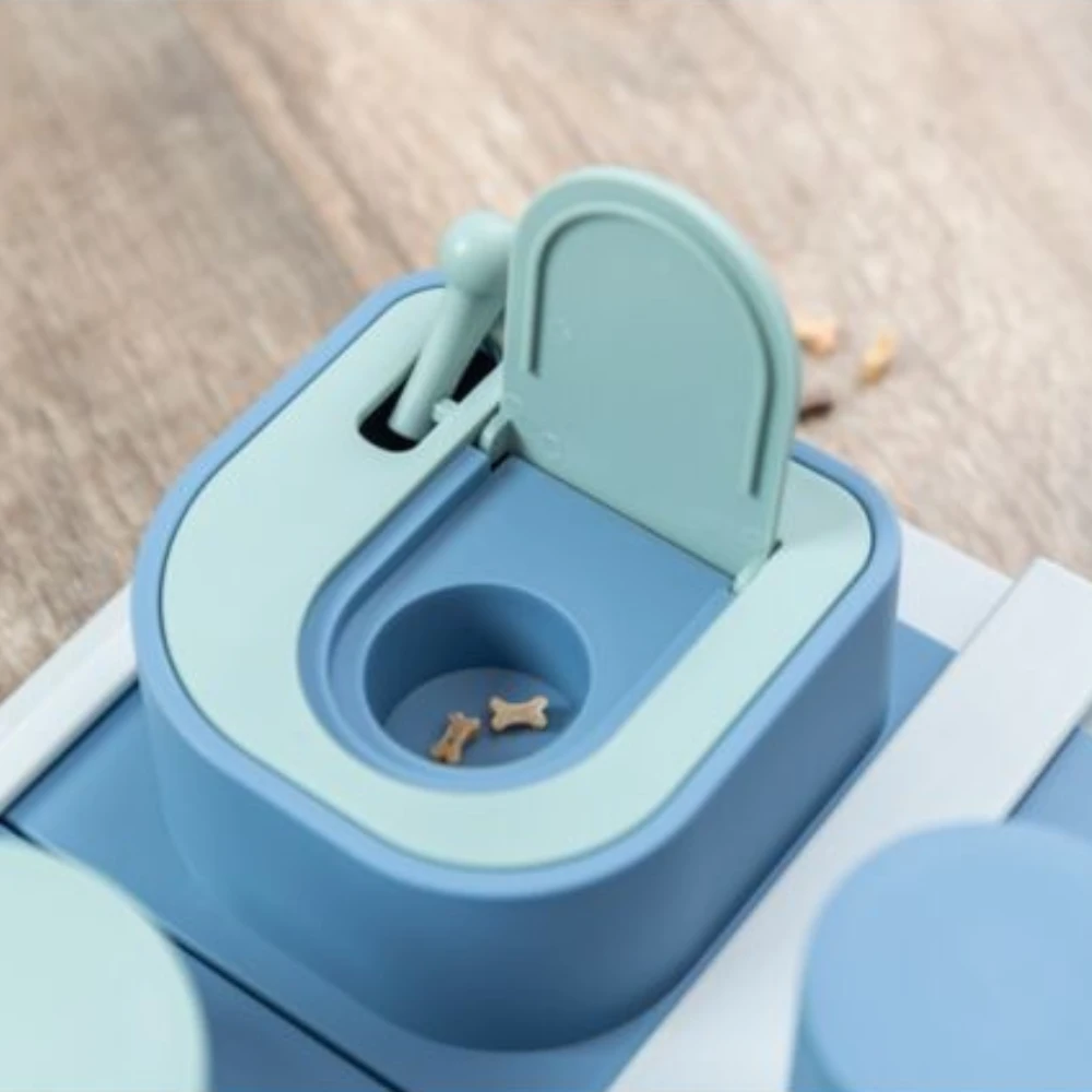 Ce jouet interactif pour chien propose différents systèmes d’ouverture comme des couvercles, glissières et éléments à manipuler. Le chien doit donc comprendre chaque mécanisme pour accéder à la récompense.